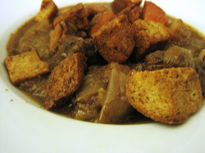 Since I had previously paired the croutons with a salad, I wanted to try it with a soup instead.  A few weeks ago, I made a huge batch of rustic beef stew and I froze half of it.  Since I knew I'd be working late, I took the beef stew out of the freezer to dethaw during the day.  Besides, I figured that a rustic beef stew would be perfect for a St. Patrick's Day dinner.  We usually eat beef stew with a piece of crusty bread, but we decided to try the croutons with the stew instead.