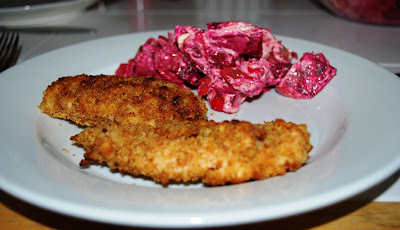 We did a simple flour, egg and bread crumb coating and baked the chicken in the oven.  I paired the chicken with a roasted beets tossed with goat cheese, white champagne balsamic vinagrette, caramelized onions, olive oil and a garlic mustard.  I used a recipe adapted from one of my favorite food blogs, Closet Cooking.