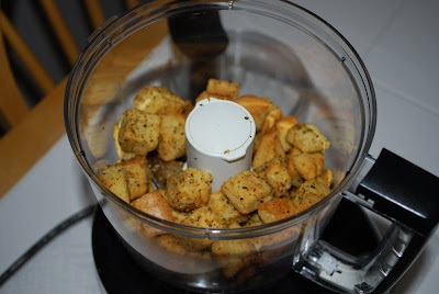 I decided to use the croutons to make a nice bread crumb coating for some chicken tenders.  I decided to use our handy food processor, which is one of my favorite kitchen appliances, to grind the croutons up to a fine crumb texture.