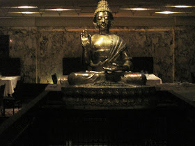 While the outside looks like just another office building, the inside couldn't be more different. Mantra has a sleek modern look to it more akin to a restaurant in New York than in Boston. Italian marble floors and countertops are complemented by dark wood tables, plush seating, and sheer silk curtains. One of the major centerpieces of the restaurant is a huge golden buddha which is definitely a conversational piece.