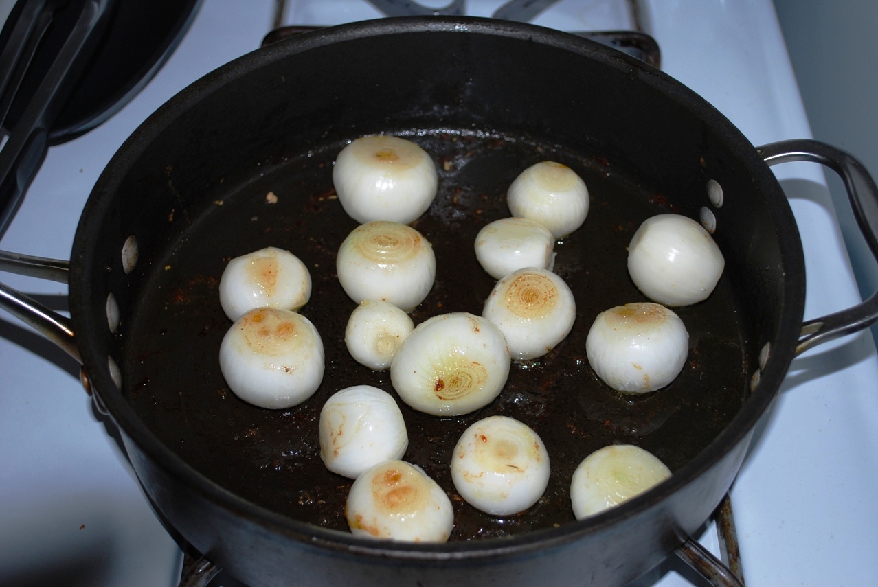 We then got to work on the vegetables. I peeled about a dozen of small boiler onions. I added it to the sauce pan with some olive oil to get some nice color on the onions.
