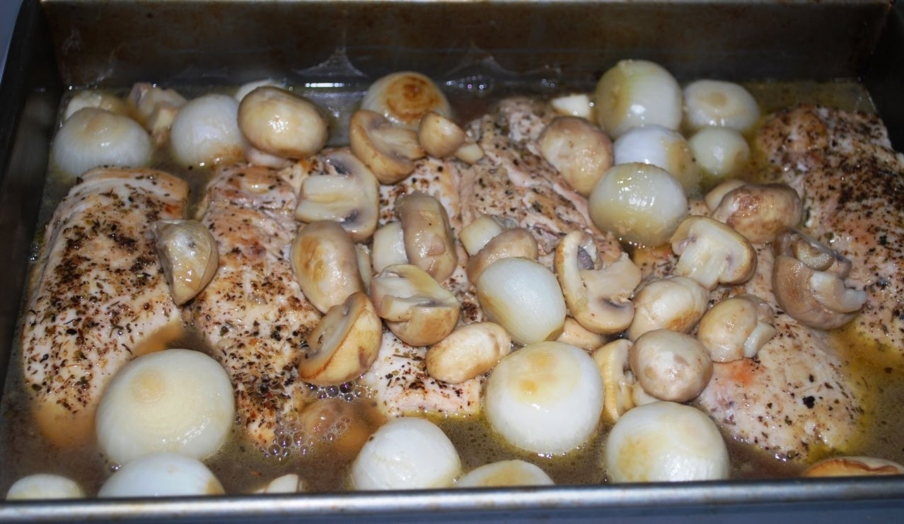 Because we didn't have a casserole dish big enough, we added the chicken breasts along with three halved cloves of garlic to a baking pan and set it aside.