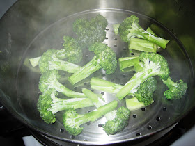 B put a lid on the skillet and let the sauce cook down for awhile. This timed out perfectly because while the chicken and mushroom sauce cooked down, the water began to boil for the steamed broccoli.