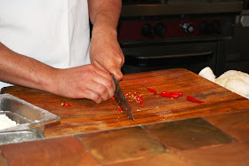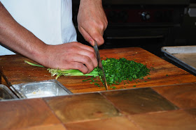 It was a gorgeous Saturday morning and B and I were happy to walk over to the South End from our apartment. We arrived shortly before 10 A.M. and were enthusiastically greeted by the ever so friendly Cheri Clarkin along with our instructor for the morning, Chef Matt Barros. The entire staff had on name tags and we soon found our own, grabbed a cup of tea and took our place at the chef's counter. Soon thereafter the restaurant's proprietors, Christopher Myers and Joanne Chang, arrived...along with a platter of pastries from one of their Flour bakeries, which we were all happy to munch on. With sweet pastry treats in our tummies and a warm introduction from Christopher Myers, we were ready to begin our cooking adventures.