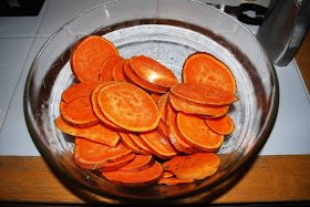 We first started out by making very simple sweet potato chips. B scrubbed one large sweet potato and thinly sliced it. I tossed the sliced sweet potatoes in extra virgin olive oil, coarse salt and fresh cracked pepper.