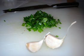 In addition to our sweet potato chips, we decided to make little meatballs for dinner. We only had about one pound of ground beef on hand but we did have some garlic and green onions, which we chopped and added to the meat.