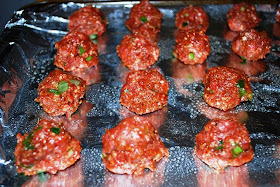 We decided to jazz the meatball up a little bit and added half a packet of taco seasoning we had on hand. Whenever we buy one of those taco kits, we never use the packaged taco seasoning since we usually make our own but at the same time we never can seem to throw the seasoning out. In addition to half the taco seasoning packet, we also added about a tablespoon of spicy chili rub to the meat. B mixed the meat together without overworking it. I cut up some cheddar cheese into small cubes we had on hand in the fridge. I initially thought we would shred a little cheese on top of the meatballs but B suggested that we put a small cube in the center of the meatball for a melted cheese center.