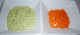While the sweet potato chips and the taco meatballs were in the oven we got to work on the dipping sauce. Since the chips would be sweet, I wanted to contrast it with a spicy dipping sauce. I put together a quick and simply sauce made of Sriracha and light mayo. For the meatballs, B decided to make a quick avocado cream that we had used on some chicken burgers the previous weekend. B mashed up one ripe avocado and added light sour cream to make it creamy.