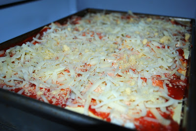 Then came the fun part - putting together the lasagna. While B was absent in the kitchen during the cooking, he wanted to participate in the actual construction of the lasagna. First, B gave a 9 x 13 baking dish a nice coating of cooking spray. On the bottom layer, I added about a third of my turkey red sauce and spread it out for a nice thin layer on the bottom of the dish. Next, I added the lasagna noodles. Since this was my first attempt at lasagna, I decided to cheat and use the no-bake noodles. After the noodles, B spread out a thin layer of the ricotta cheese mixture. This was a bit difficult as the cheese was thick but I reminded him that it didn't need to be perfect! I added a healthy layer of shredded mozzarella cheese along with a layer of the wilted spinach. This was the first layer and we repeated this step two more times. We topped the lasagna with a layer of lasagna noodles, sauce and then a healthy spread of mozzarella cheese along with a sprinkling of Parmesan cheese (although this was of the leftover pre-packaged variety since I used all of our fresh grated cheese earlier with the ricotta mixture).