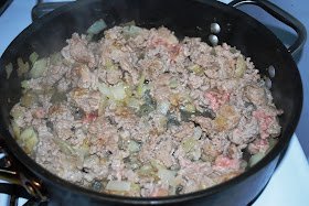 I heated up a sauce pan on the stovetop and added a few tablespoons of extra virgin olive oil on medium high heat. When the pan was hot, I added the chopped onions and cooked them until they were translucent. I then added the garlic and cooked them for a few minutes before I added about one pound of ground turkey. I cooked the turkey for about eight minutes - not quite browning it but just cooking it through.