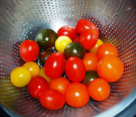 Since KK wasn't coming over for dinner for a few hours, we put the lasagna in the fridge. Meanwhile, I got to work on a simple salad to accompany our lasagna. I planned on using half a package of Olivia's Organics 50/50 Blend, which is half baby spinach and half spring mix. I washed a package of beautiful cherry tomatoes in a variety of colors - red, organge, yellow and even purple. They were too gorgeous for me to pass up.