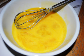 After the garlic was sauteed, B took it out of the pan and set it aside to cool. While the garlic was cooling, we began to prep our other ingredients for the meatballs. I whisked up two eggs.