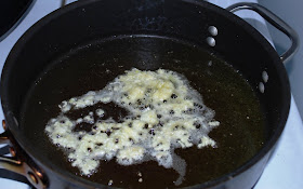 While the sauce was on a low simmer on the back burner, we got to work on the meatballs. First, B minced and sauteed eight small cloves of garlic. We doubled the amount called for in the recipe since we both really like garlic.