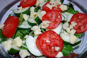 While the fish was cooking, we decided to make two simple sides to go with the fish. The most obvious was a very basic salad with Olivia's Organics spring mix salad with a sliced vine-ripe tomato, sliced cucumbers, sliced avocado, and aged Cabot cheddar cheese.