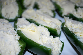 While the salad was refreshing, we wanted to make something that didn't really go with the meal but we both really wanted to make. We saw a recipe for cheese stuffed jalapeno peppers in the most recent issue of Everyday Food. Our friend M makes something very similar as an appetizer for parties and we both really wanted to make it ourselves. We went to Savenor's Market and picked up half a dozen jalapeno peppers.