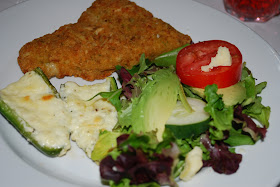 B placed the jalapenos on the tray with the fish and broiled it for about ten minutes. The end result was a very simple but surprisingly delicious dinner. The cod was delightfully moist with a thick potato, cheddar and chive crust. The crust was so flavorful that it didn't need any sauce. While the salad was a light and refreshing side to the fish, the spicy jalapenos added a nice rich and cheesy goodness to the meal.