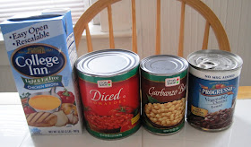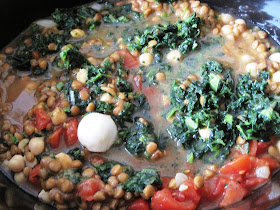I then added about half a bag of frozen spinach. The spinach was never part of the original recipe but I thought it would make a nice addition to this rustic soup. I then added my liquid ingredients, including a cup of chicken broth, a large can of diced tomatoes, and a can of lentil soup. I usually add black beans to the soup but I surprisingly didn't have any in my pantry so I added a can of drained garbanzo beans instead.