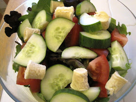 I wanted to make a side salad with the soup for dinner using leftover Olivia's Organics Spring Mix. I added half a cucumber, a tomato and some Shy Brothers Hannahbell cheese.