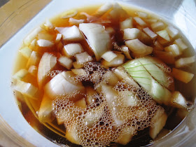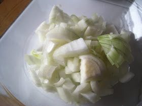 I added one cup of beef stock to the onions and B got going on heating these two ingredients on the stove. The recipe called for beef broth but I had a box of beef stock open in the refrigerator and I didn't want it to go to waste.