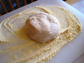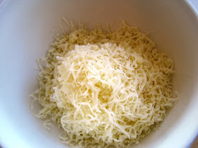Bret then got to work on the pizza dough. We finally got to use our Chinese wooden rolling stick that we purchased at the suggestion of Chef Matt Barros from Myers & Chang. This made all the difference as it helped us roll out a perfect pizza circle, which we hadn't be able to accomplish with a normal rolling pin. While Bret worked on the pizza dough, I shredded about a quarter of a block of leftover Cabot's Seriously Sharp Cheddar Cheese.