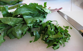 First, I rinsed and dried a handful of beet greens. The first time that I cooked with beet greens, I found that they were a little wilted by the time I got to work on them. So I have to thank my friend Robin for giving me the helpful hint to immediately cut off the beet greens when you purchase the beets and store the greens in a tight storage bag. After a week in the fridge, the beet greens were still crisp and fresh. I de-stemmed the leaves and got to work coarsely chopping up the beet greens.