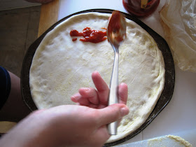 Then we were onto the fun part - putting together the pizza! First we placed the tomato sauce on the pizza. We decided to use a bottle of Bertolli Marinara with Burgundy Wine.