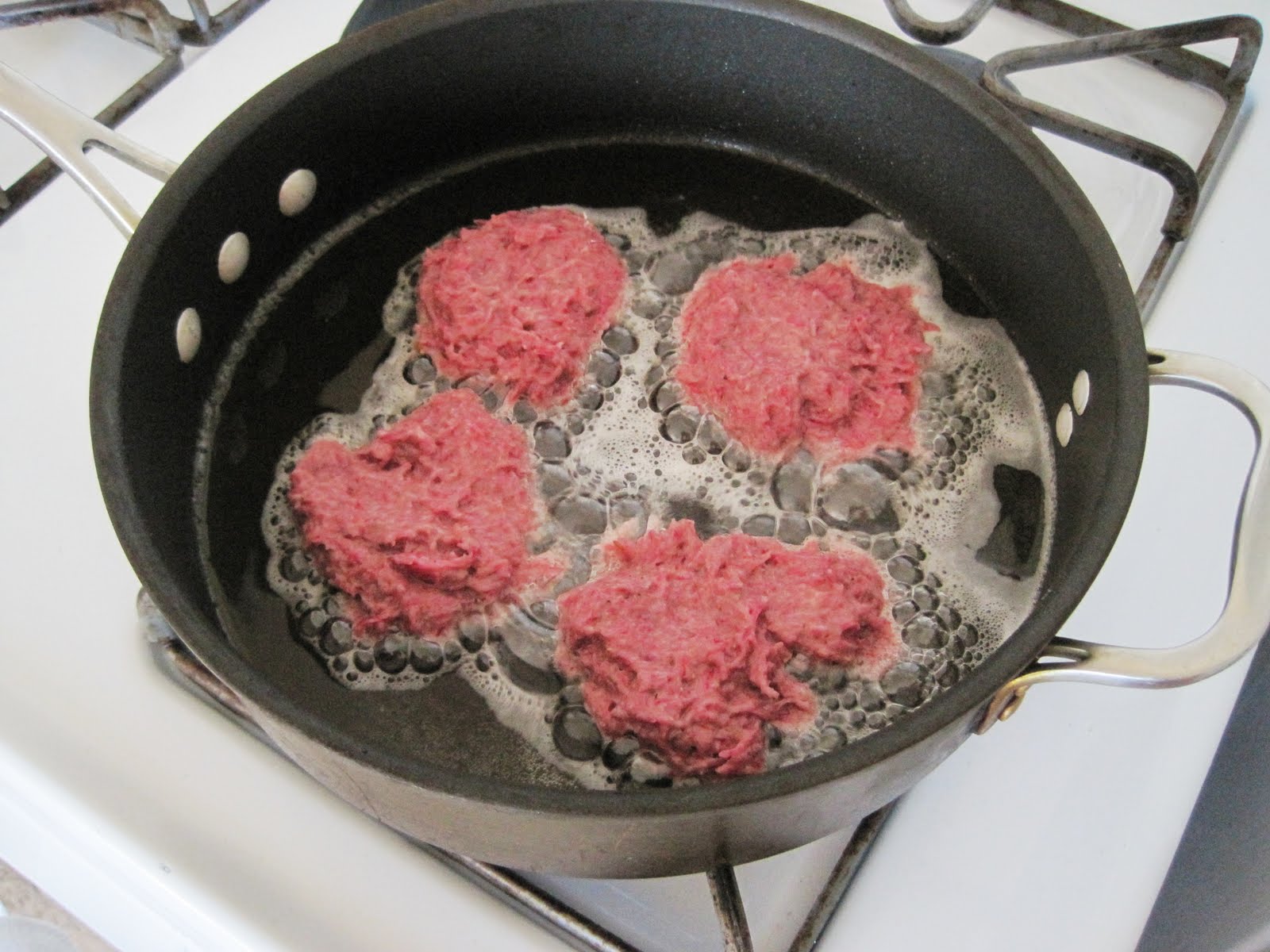 When the sugar snap peas were done steaming, I gave them a cold rinse and place them in the refrigerator to cool down. By this time, we were ready to begin assembling our latkes. Our beets resulted in only three cups of shredded beets once B absorbed the moisture with a paper towel so we just halved the latke recipe and combined flour, salt, cumin, coriander, baking powder, black pepper, and two eggs. Using a quarter cup for each patty, this resulted in about eight patties.