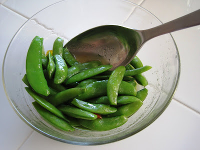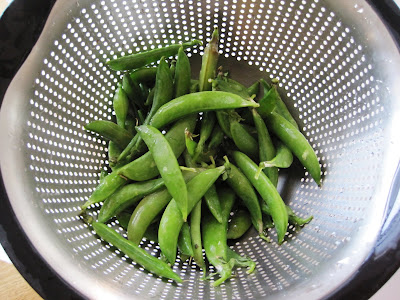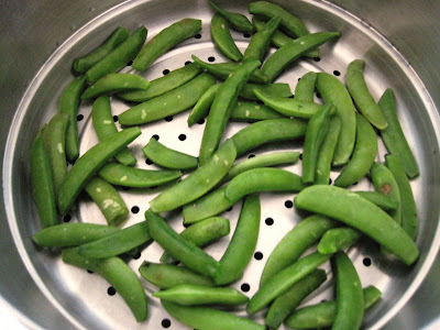 I put some water on boil in my vegetable steamer while I washed and trimmed the sugar snap peas. When the water started boiling, I steamed the sugar snap peas for about five minutes.