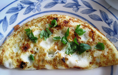 When the omelette was nearly ready, I added the cubed mozzarella to the omelette and then folded the omelette in half. The omelettes slid off my non-stick pans so easily onto to the plate and I topped the omelettes with some fresh chopped basil.