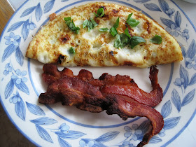 When I woke Bret up, he told me that there is no better way to wake up than to the smell of bacon. He was thrilled that I made this healthy and hearty breakfast. The egg whites had a lot of nice flavor, especially from the sweet cherry tomatoes and the fresh chopped basil. Since these three ingredients make up a Caprese salad, I decided to call this breakfast my Caprese egg white omelette, which is bound to make repeat appearances in my kitchen this summer!