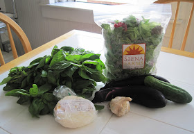 While I drained the whole wheat angel hair pasta and tossed it in the sauce, Bret made a quick salad using the bag of mixed greens from Siena Farms, a cucumber from my mom's garden, and some delightful yellow cherry tomatoes.