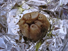 I drizzled the garlic bulb with olive oil and wrapped it in aluminum foil. I put the garlic on the baking tray with the roasted eggplant and put it in the oven at 400 degrees for about twenty minutes.