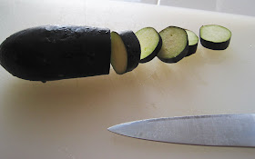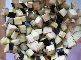 While I love eggplant in any form, Bret isn't the biggest fan of its texture. I decided to make a simple roasted eggplant pasta dish to utilize the eggplants in a way that that I thought Bret would enjoy. I first started out by slicing my eggplant with the skin on and then eventually cubing it.
