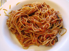 When the garlic and eggplant were ready, I added both to my sauce, along with half of the chopped basil. Both the eggplant and the garlic were so aromatic and added nice flavor and texture to the sauce.