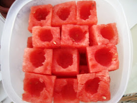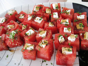 The day before the party, Bret purchased a watermelon and cubed it for me while I was out at a girls golf outing. Bret creatively scooped out a little at the top of each watermelon cube to make room for the feta cheese.