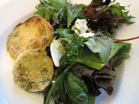 I gave the salad a quick toss with the dressing and then topped it with my golden-brown crusty baked green tomatoes. I didn't intend for a vegetarian meal that night but the green tomatoes were so huge that it seemed unnecessary to add meat to this dish.