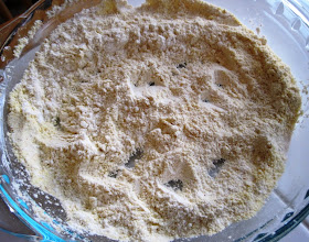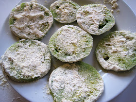 I then dredged the slice in a dry mixture consisting of 1/2 cup of all-purpose flour, 1/2 cup of yellow cornmeal, and a few generous pinches of salt, black pepper, and cayenne. I also added a pinch of sugar since the green tomatoes were tart and I wanted to add just a small touch of sweetness.