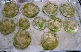 I wanted to make a healthier version of fried green tomatoes by baking them instead of frying them. I try to make this easy substitution in a lot of my dishes, like my sweet potato chips or beet chips. So I turned on my oven to 400 degrees. While the oven was pre-heating, I put a sheet of aluminum foil (for easy clean-up) on a large baking tray and put that in the oven as well. I remembered Chef Matt Barros telling us this past weekend how it is so important to make sure that your pan is hot to get a nice crispy texture. I figured it wouldn't hurt with this dish either.