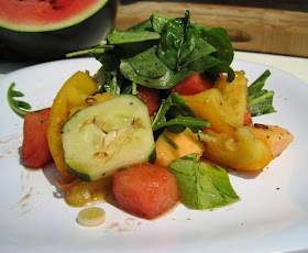 As he chatted, Chef Ben made a fantastic refreshing salad with watermelon, cantaloupe, tomatoes, cucumber, scallions, green beans and arugula. I loved that he spoke so sincerely about the importance of why we cook. We cook for others (whether it is for our friends or family) and we should enjoy that time. Cooking should be kept simple and with great local ingredients, you don't need to do much to let the flavors shine. His thoughts on food and cooking are something I completely agree with and it was lovely to hear this from a professional. Before you knew it, the salad was done and was given a nice toss with salt, pepper, olive oil and balsamic before the dish was plated.