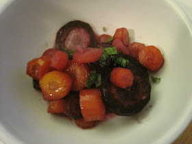 I loved how the carrots almost looked like beets from the bright purple carrots. The carrots were sweet and I thought that the agave nectar would make the carrots overly sweet but the wine and mint really balanced the sweetness out.