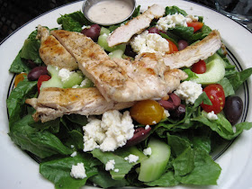 In addition to the grilled chicken, the salad was topped with peeled and seedless sliced cucumbers, yellow and red grape tomatoes, feta cheese, Kalamata olives and sliced pepperocini.  The oregano dressing was creamy but didn't really carry the oregano flavor.  Still, I'd have to say this was one of the best Greek salads I've had in awhile.  Abby equally enjoyed her grilled pear salad, which she dug into before I could snap a photo!