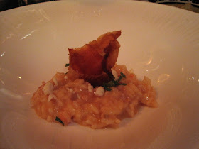 The panko-crusted fried green tomatoes were served with opal basil pesto and a thick slice of buffalo mozzarella was served "in carrozza" on top of the hot tomato. This helped the mozzarella melt ever so slightly for a tender texture contrast to the crispy tomato. This dish also had slivers of the fresh purple opal basil. I really loved the 2008 Larochette Manciat, Macon Les Morizovittes, which was served with this dish. Normally I don't enjoy chardonnay but this was unoaked and it went down so smoothly.