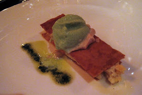 Our dessert course was an Organic Peach Tomato Napoleon layered with a tangy peach tomato yogurt gelato, cinnamon basil yogurt gelato, thin puff pastry, vanilla bean creme anglaise and pistachio-estevia pesto.