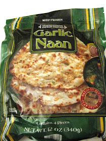 While I was at Trader Joe's, I also picked up a package of frozen garlic naan. The preparation was so simple. I preheated the oven to 400 degrees and once the oven was at the right temperature, I put the naan straight in the oven for just a minute and a half.