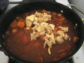 I lowered the heat on the sauce and added the chicken. I stirred all of these ingredients together and then put a lid on the sauce to let it simmer.