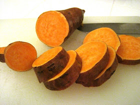 I put the chicken on the stove and while I waited for the poaching liquids to come to a boil, I got to work on the other ingredients. I had a leftover sweet potato that I brought back from Ogunquit during our family dinner. I sliced and then cubed half of this very large sweet potato.