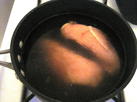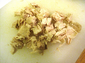 Once the poaching liquids came to a boil, I turned the heat down as low as it could go, flipped the chicken breasts over and put a lid on the saucepan to let the chicken breasts continue cooking for about twenty minutes. After twenty minutes, I put the chicken breasts on a cutting board and let it cool. I roughly chopped and shredded the chicken into large chunks.