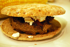 When the burgers were done, Bret sprinkled the patties with a bit of the salt.  We then put our burgers together.  Bret opted for a brioche bun but I decided to be good and opted for a whole grain sandwich thin.  I topped my burger with ketchup, mustard and goat cheese crumbles (also leftover from the cherry tomato and goat cheese tart).