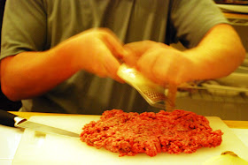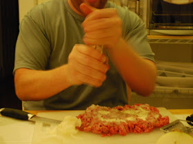 First, Bret spread the meat out on a board and grated half of an onion in it.  This was grated very finely so that just onion juice and finely grated raw onion was on the beef.