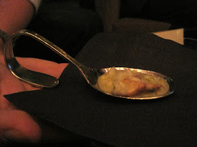 This looked like your typical traditional martini, but it had a very smoky twist - 2 1/2 oz Bombay gin, splash of Laphroaig, lemon twist. Laphroaig is a smoky whiskey and a little went a long way. Bret loved its smokiness but the rest of us could only manage a few sips. The martini, however, paired well with a perfect bite of mushroom risotto. The smoky whiskey definitely brought out the earthy flavor of the mushrooms.